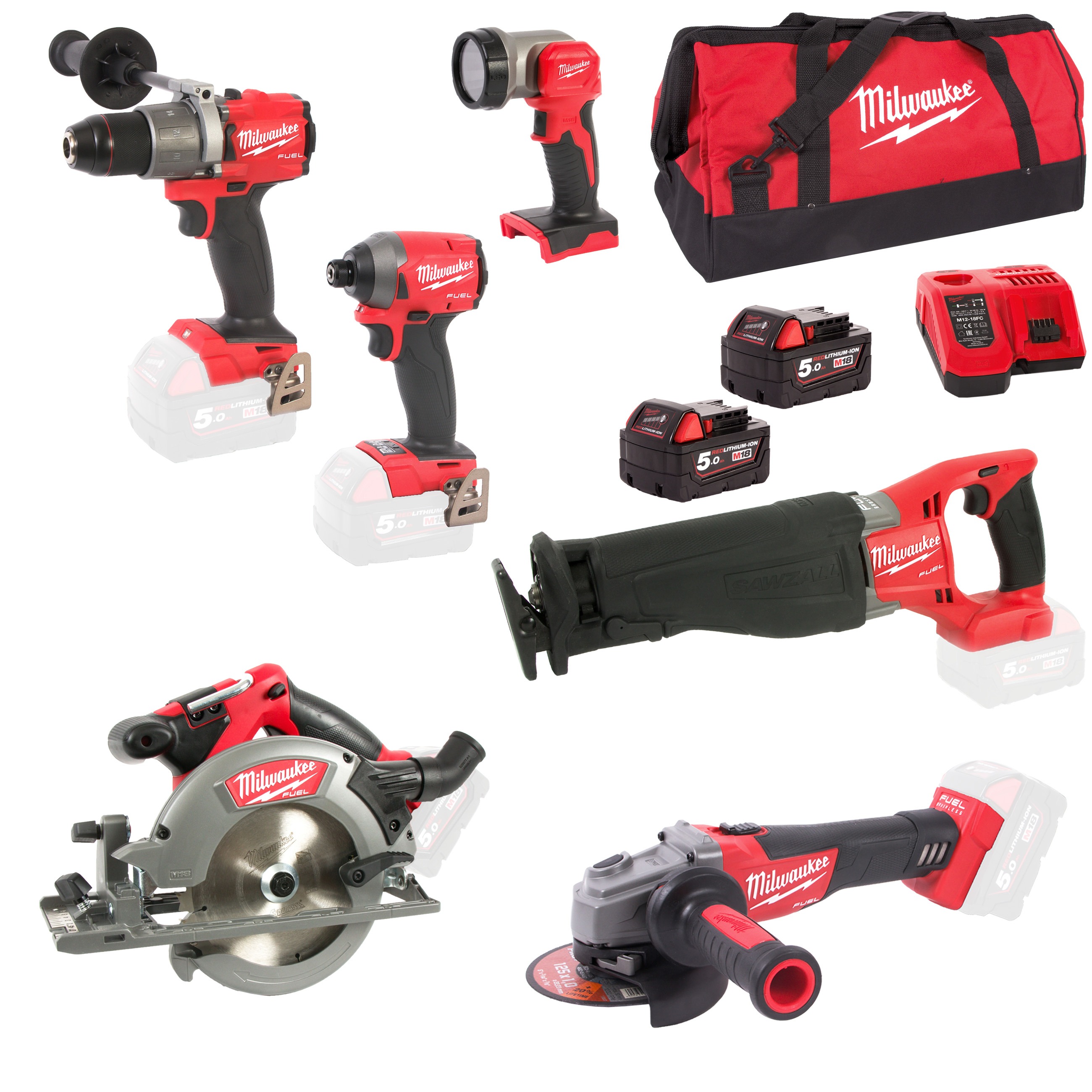 MILWAUKEE AKU SET NÁŘADÍ M18 FPP6C2-502B (VRTAČKA, ROZBRUS, OKRUŽNÍ PILA, OCASKA, RÁZOVÝ UTAHOVÁK)